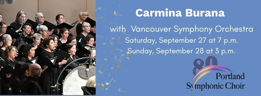 Carmina Burana with Vancouver Symphony Orchestra Matinee Sunday, September 28, 2025 3:00 PM 5:00 PM Google Calendar ICS Sunday, September 28 at 3 p.m.The Portland Symphonic Choir joins Vancouver Symphony Orchestra, returning by popular demand to perform Orff's timeless Carmina Burana, and the Hymn to the Sun, from a Mascagni intermezzo. Tickets through VSO starting September 2nd